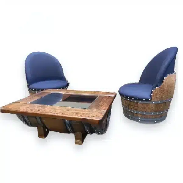 • Kiểu dáng: Ghế thùng tròn, tựa lưng bọc da có đinh tán trang trí, bàn vuông mặt kính trong suốt